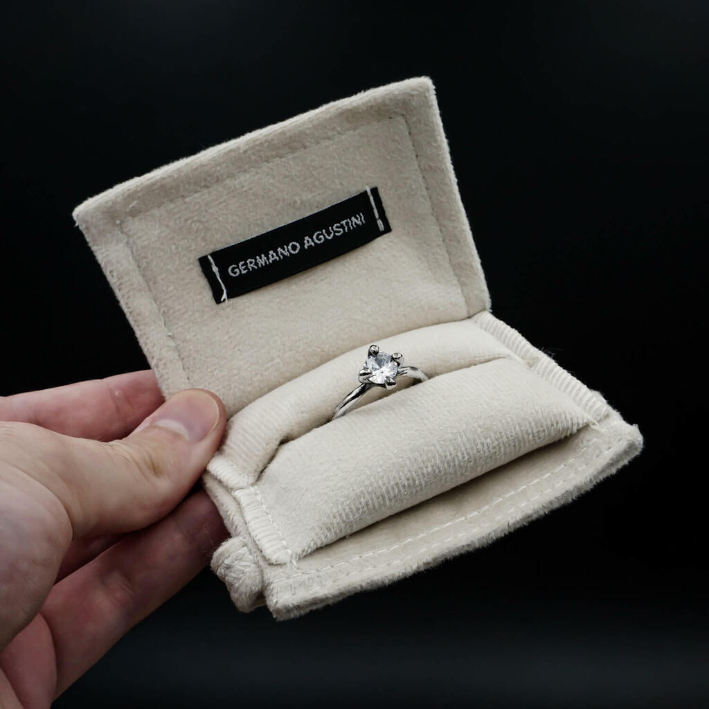 Contém um porta joias de tecido para alianças junto a todos os materiais gráficos padrão da embalagem.